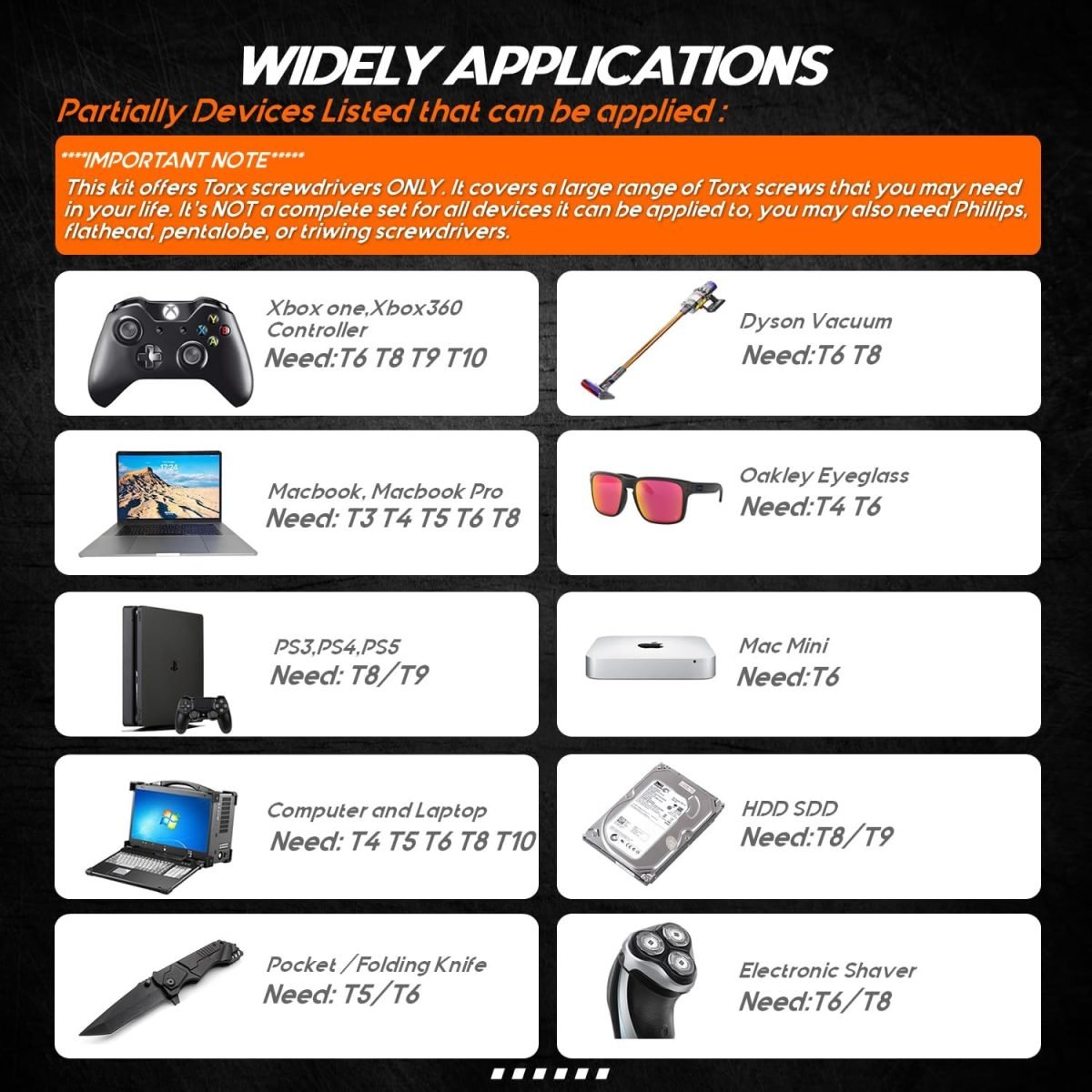 • Package includes 1 x T8 Security screwdriver; 1 x T6 Security screwdriver; 1 x T10 Security screwdriver; 1 x Triangle prying tool; 2 x Double-ended prying tool; 1 x Cleaning brush
