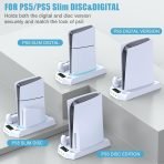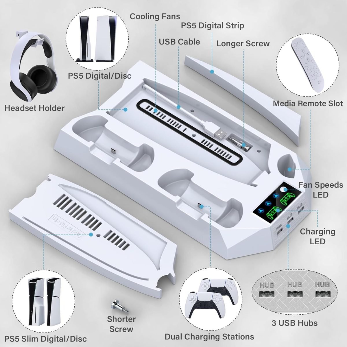 ♣PS5 vertical stand with cooling fan, controller charging, game storage and headphone clip is compatible with both Playstation 5 Digital Edition & Disc Edition Consoles.